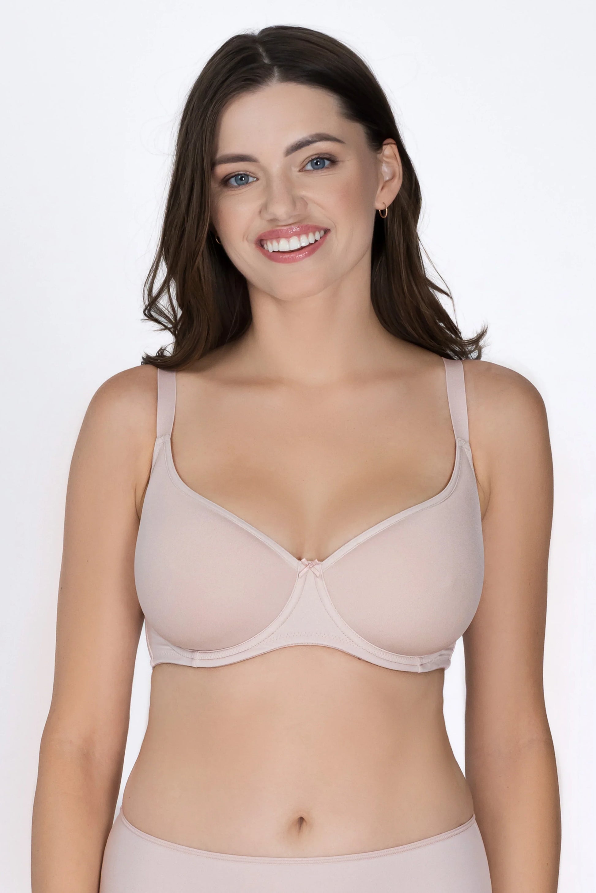 Super soft T-shirt bra with underwires. Moulded cups made from thin, breathable ‘Spacer’ fabric create a beautiful breast shape and are invisible even under light clothing. The bra has extra thin and flexible underwires that move with you, so there is no discomfort and it feels like a non-wired bra. Classic adjustable shoulder straps for a custom fit.